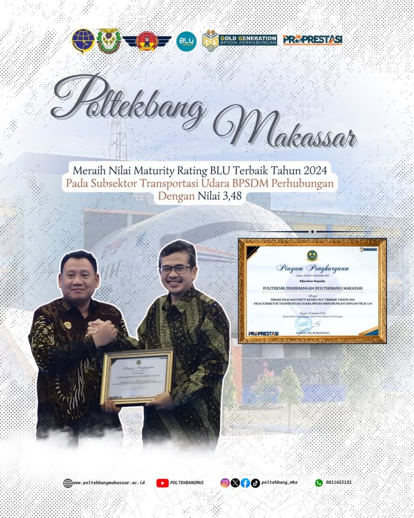 Politeknik Penerbangan Makassar meraih nilai Maturity Rating BLU terbaik Tahun 2024 pada subsektor transportasi udara BPSDM Perhubungan dengan nilai 3,48.